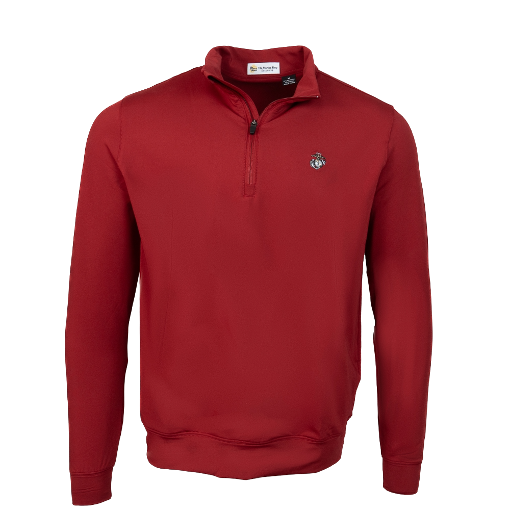 Designed with a sleek quarter-zip front and a stand collar for a versatile look that transitions effortlessly from casual outings to light workouts. Whether you’re on the move or just kicking back, this pullover delivers all-day comfort and timeless style. Features an embroidered eagle, globe, and anchor on the left chest.
