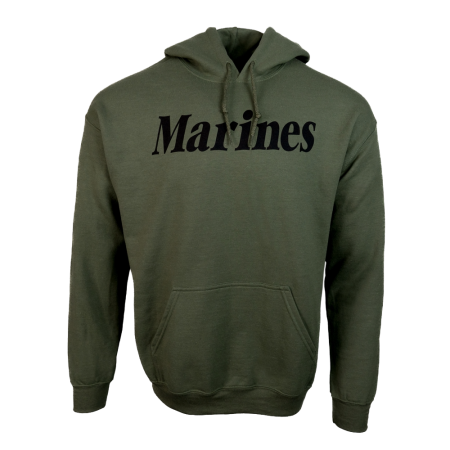 Display your pride for the United States Marine Corps with the Marines Pullover Hooded Sweatshirt. Proudly featuring “MARINES” in bold black lettering across the front, this USMC hoodie is perfect for enthusiasts. Equipped with a front kangaroo pouch pocket for easy storage, the hoodie offers convenience on the go. The drawstring hood and elastic wrist cuffs ensure a snug fit, ideal for rugged workouts or casual wear, while shielding against the elements.