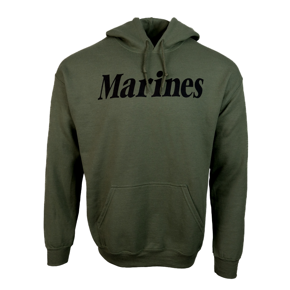 Display your pride for the United States Marine Corps with the Marines Pullover Hooded Sweatshirt. Proudly featuring “MARINES” in bold black lettering across the front, this USMC hoodie is perfect for enthusiasts. Equipped with a front kangaroo pouch pocket for easy storage, the hoodie offers convenience on the go. The drawstring hood and elastic wrist cuffs ensure a snug fit, ideal for rugged workouts or casual wear, while shielding against the elements.